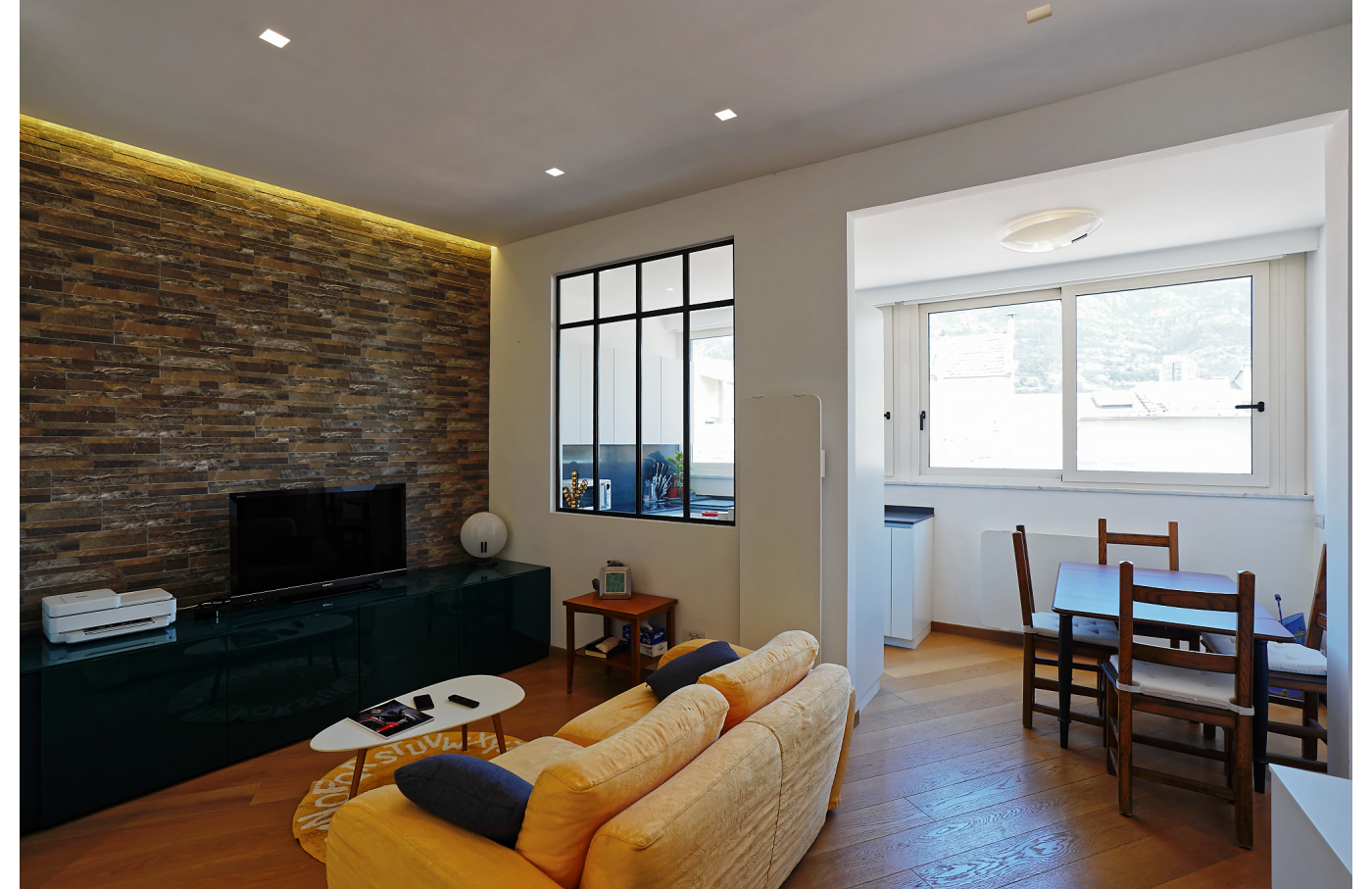 On the lower floor, a three-room apartment is also for sale, which you can use either separately or together to create a duplex.